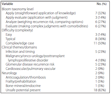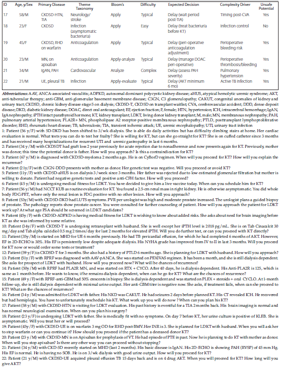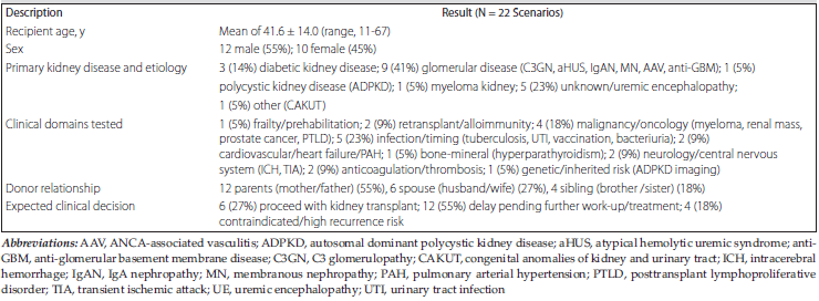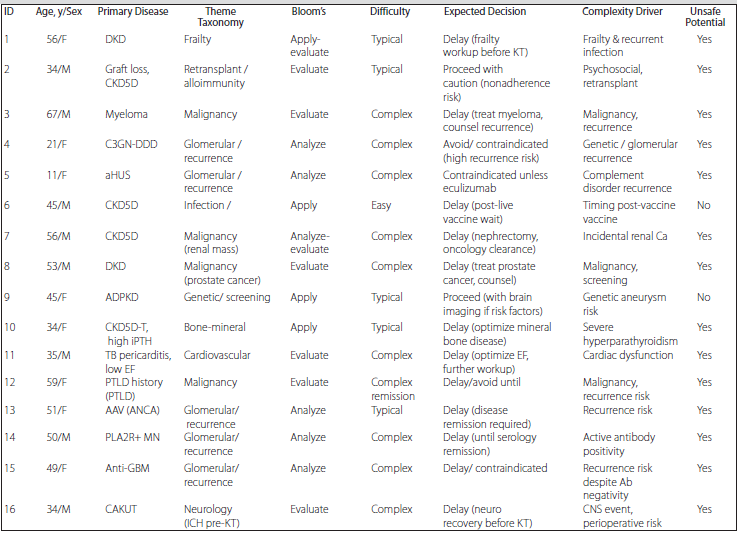 We designed 22 clinical vignettes that reflected real-world LDKT recipient scenarios (Table 1). Each vignette was reviewed by a multidisciplinary panel of 3 transplant nephrologists for validity, realism, and safety implications. Vignettes were mapped to Bloom’s taxonomy (apply, analyze, evaluate) and stratified by complexity (easy, typical, complex/edge-case). Clinical domains included infection and timing, malignancy, glomerular disease recurrence, cardiovascular risk, neurologic comorbidities, anticoagulation, and frailty. Experts independently flagged unsafe deci-sion potential.