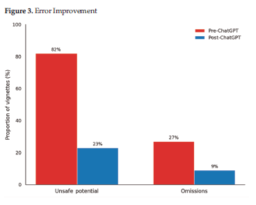 Across the 22 vignettes, unsafe potential (Figure 3), defined as a response that could plausibly lead to patient harm if acted upon, was present in 18 cases (82%) when fellows responded unaided. With ChatGPT5 intervention, this proportion decreased substantially to 5 cases (23%) (absolute reduction, 59%; P < .001). Omissions of key clinical considerations were observed in 6 vignettes (27%) at baseline, most notably in scenarios involving frailty (vignette 1), retransplant with nonadherence (vignette 2), high-risk glomerulopathies (vignettes 4 and 15), bone-mineral disease (vignette 10), and pulmonary hypertension (vignette 21). After the ChatGPT5 intervention, omissions decreased to 2 vignettes (9%), representing an absolute reduction of 18% (P = .01). The most significant benefit was observed in complex glome-rular recurrence and cardiovas-cular cases, where omission rates were nearly eliminated.