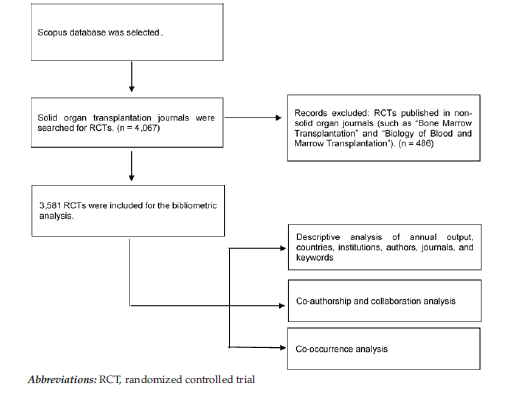 On July 17, 2023, we searched solid-organ transplant journals for RCTs in the Scopus database. For journals, we searched the following: American Journal of Transplantation, Clinical Journal of the American Society of Nephrology, Journal of Heart and Lung Transplantation, Nephrology Dialysis Transplantation, Transplantation and Cellular Therapy, Liver Transplantation, Transplantation, Cell Transplantation, Xenotransplantation, Transplanta-tion Reviews, Clinical Kidney Journal, Clinical Transplantation, Transplant International, Current Opinion in Organ Transplantation, Transplant Infectious Disease, Transplantation Direct, World Journal of Transplantation, Pediatric Transplantation, Current Transplantation Reports, Annals of Transplantation, Renal Replacement Therapy, Transplant Immunology, Transplantation Proceedings, Progress in Transplantation, Experimental and Clinical Transplantation, Transplant Research and Risk Management, International Journal of Organ Transplantation Medicine, Saudi Journal of Kidney Diseases and Transplantation, Transplantology, OBM Transplantation, Organ Transplantation, Cellular Therapy and Transplantation, Korean Journal of Transplantation, Transplantologiya, Cell and Organ Transplantology, Indian Journal of Transplantation, Heart, Vessels and Transplantation, Transplantation Reports, and Turkish Journal of Nephrology. We used the key word “randomized controlled trial.” (Figure 1) illustrates the flow diagram of the literature search, selection, and analysis processes.