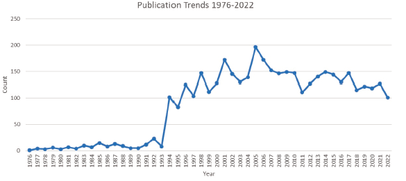 Notable fluctuations were shown in the quantity of RCT publications. Initially, between 1976 and the early 1990s, the number of RCTs ranged from 1 to 10. However, a significant increase in the number of RCT publications occurred beginning in 1993, which peaked in 2005 at 196 RCTs. Since then, the number of RCT publications has continued to fluctuate, eventually reaching 101 RCTs in 2022, which represented the lowest number of RCTs published in the preceding 20 years (Figure 2).