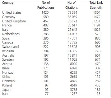 Of 144 countries, most of the publications and citations, respectively, were undertaken by the United States (n = 1420, n = 78 384), followed by Germany (n = 580, n = 33 089), United Kingdom (n = 467, n = 26 173), France (n = 402, n = 25 617), and Italy (n = 389, n = 21 642) (Table 1).