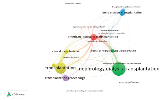 (n = 769), Transplantation Proceedings (n = 660), and Transplantation (n = 622). Transplantation also re-ceived the highest number of citations (n = 44 054), followed by Nephrology Dialysis Transplantation (n = 36 895) and the American Journal of Transplantation (n = 26 996) (Table 3). (Figure 3) shows the top journals publishing RCTs in transplan-tation and their interconnections between the clusters.