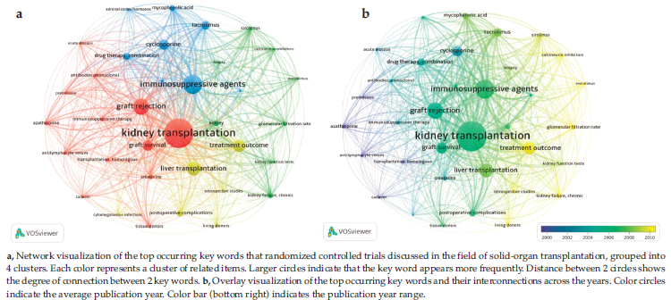 Figure 4.Key Word Network and Overlay Visualization of Randomized Controlled Trials in Solid-Organ Transplantation
