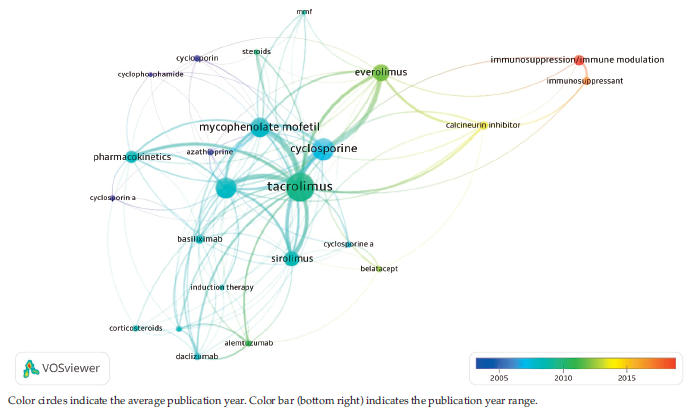 (Figure 4a) shows a network map illustrating the most frequently encountered key words discussed in RCTs within the domain of solid-organ transplantation, represented through cluster visua-lization. The predominant emphases within these clusters were kidney transplantation, liver transp-lantation, graft outcomes, and immunosuppressive agents. (Figure 4b) shows an overlay map of these key words from 2000 to 2010. Analyses of the medication-related key words revealed that tacrolimus was the most frequently studied medication, followed by cyclosporine and mycophe-nolate mofetil (Figure 5).