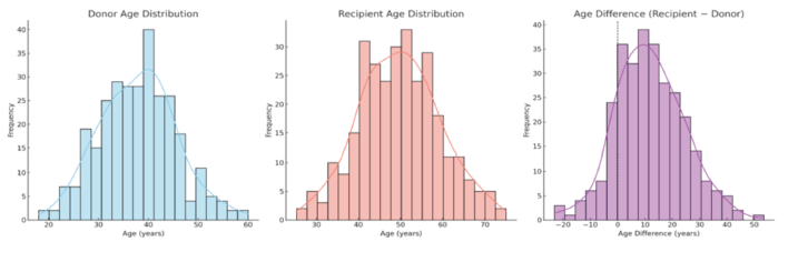 Recipient age exhibited a broad distribution, with median of 50 years (IQR, 39-59 y), compared with 37 years (IQR, 32-44 y) for donor age. The mean donor–recipient age difference was +13.1 ± 8.6 years, with 82.4% of recipients being older than their respective donors (Figure 1).