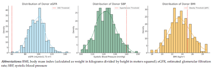We presented categorical data as numbers and percentages and continuous data as median and respective interquartile range (IQR). We made between-group comparisons with parametric or nonparametric tests. To assess the baseline distri-bution of key donor characteristics, we constructed univariate histograms for the following continuous variables: eGFR, BMI, systolic blood pressure (SBP), and age difference between the recipient and donor. We generated histograms by using R (version 4.3.1) with the ggplot2 package. For clarity, each histogram was overlaid with a kernel density curve using geom_density() to visualize the probability density function. Longitudinal trends in donor eGFR were modeled with locally estimated scatterplot smoothing (LOESS) to visualize renal recovery over time. We generated plots by using R (version 4.3.1) using the ggplot2 package, applying the geom_smooth (method = “loess”) function with a span of 0.75 for moderate smoothing. Trajectories were stratified by 4 clinical subgroups: sex (male vs female), BMI (≤25 vs >25), SBP (≤130 vs >130 mm Hg), and peak serum creatinine during index admission (above vs below median). Each plot displayed mean eGFR trends over time with 95% CI. Visual inspection of curvature and slope was used to assess differences in the extent of renal recovery. We also performed a Cox proportional hazards regression to identify predictors of incident proteinuria, defined as 24-hour urinary protein >300 mg after donation. Time-to-event was defined from nephrectomy to the first occurrence of proteinuria, with censoring at last follow-up for event-free individuals. The following covariates were used: baseline SBP (per mm Hg increase), BMI (per kg/m2), eGFR (per mL/min/1.73 m2), and peak serum creatinine during hospital stay (per mg/dL increase).