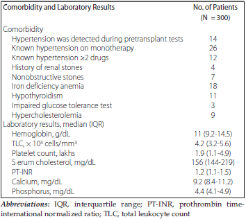 The detailed comorbid conditions and laboratory parameters before donation are shown in Table 1. The comorbidity pattern before donation was do-minated by hypertension in 56 donors (18.7%). Most donors were anemic, with median hemoglobin level of 11 g/dL.
