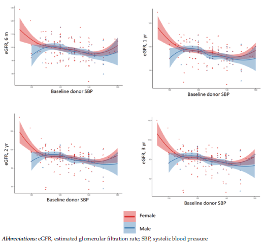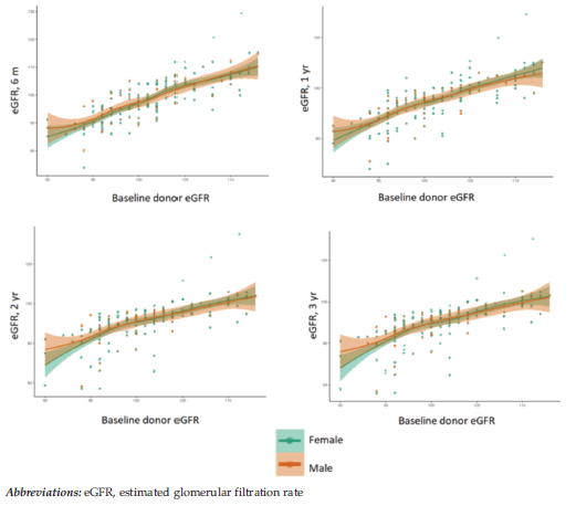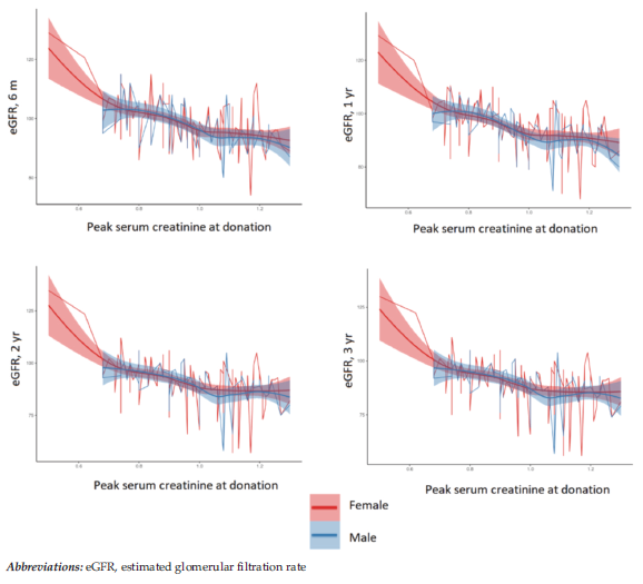 Sex-specific analysis showed comparable long-term results, but the early postoperative dip in male donors may indicate susceptibility to transient acute kidney injury or differential perioperative hemod-ynamic stress, warranting further exploration in larger prospective cohorts.