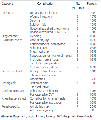 The most common perioperative complication (Table 2) was urinary tract infection, affecting 10 donors (3.3%). Other complications occurred at low frequency (Table 2). Notably, there were no cases of acute kidney injury requiring dialysis, and only 2 donors (0.7%) experienced cardiovascular events during follow-up.