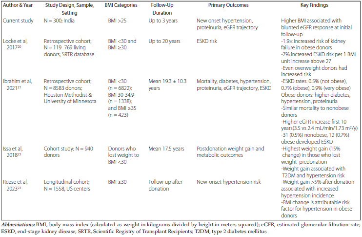 This study had several strengths. First, this large single-center donor cohort had a standardized 2-year follow-up. Second, we used population-specific criteria (eg, Indian BMI cutoffs). Our study involved advanced statistical and visual analytic techniques. These features allowed generation of new infor-mation and rich comparative analysis with inter-national data.