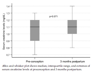 Any MMF treatment was successfully discontinued in all patients 6 weeks prior to conception. Main-tenance immunosuppression during pregnancy consisted of tacrolimus and prednisolone. Tacrolimus trough blood levels were maintained at a mean level of 3.78 ± 0.5 ng/mL throughout the gestational period. The median serum creatinine level prior to pregnancy was 1.05 mg/dL (range, 0.7-1.3 mg/dL). At 3 months postpartum, the median serum creatinine was recorded as 1.07 mg/dL (range, 0.8-1.4 mg/dL), indicating no significant deteriora-tion in renal function associated with pregnancy (P = .071; Figure 1). No episodes of acute allograft rejection were observed during pregnancy or in the immediate postpartum period.