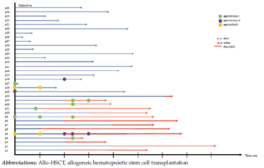 All 35 patients were Caucasian (65.7% male, median age at diagnosis 55.2 years [IQR, 30.5 years]). Of 35 patients, 27 (77.1%) were diagnosed with acute myeloid leukemia,21 and the rest of the patients (22.9%) had acute lymphoblastic leukemia. The median follow-up period was 369 days (IQR, 297 days). The follow-up duration of the entire cohort and the time points in which PRA were detected are shown in Figure 1.