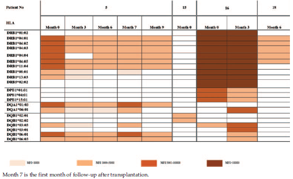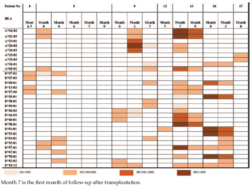 In month 3 of follow-up after transplantation, 2 of 11 patients had antibodies against either class I (patient 13) or class II antigens (patient 5). In month 6 of follow-up after transplantation, no antibodies were detected in any of the remaining 10 patients. There were no antibodies against class I and class II antigens in the remaining 7 patients in month 9 of follow-up, and there were no antibodies in any of the remaining 5 patients in month 12 of follow-up.
