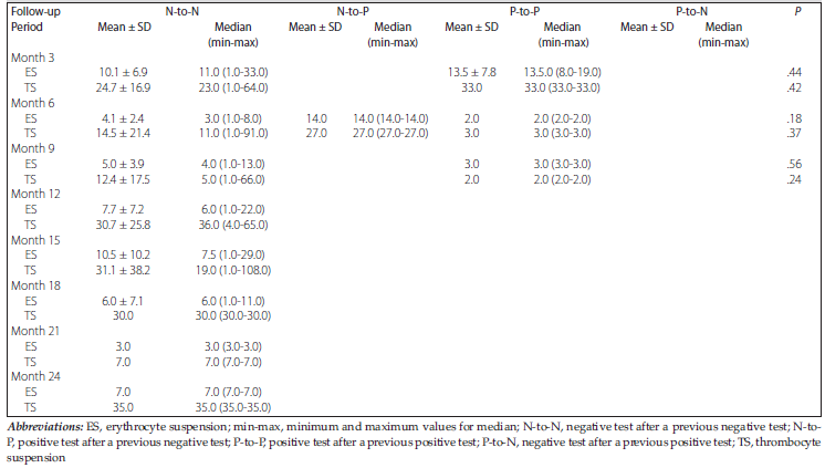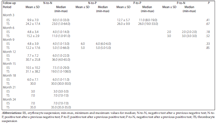 Previous transfusions and the number of pregnancies were recorded. The date of diagnosis was accepted as month 0. To determine the effect of the erythrocyte and the thrombocyte suspensions transfused, patients were divided into 4 groups according to absence, formation, persistence, and/or disappearance of PRA, as follows: negative test after a previous negative test; positive test after a previous negative test; positive test after a previous positive test; and negative test after a previous positive test.