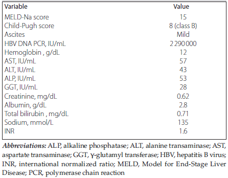 After surgical removal of the cirrhotic liver, hepa-titis B immunoglobulin (HBIG) therapy was initiated and continued for 5 postoperative days. The HBIG therapy was discontinued after HBsAg negativity was confirmed. Maintenance antiviral therapy (tenofovir) was continued, and HBIG was readministered when hepatitis B surface antibody titer values fell below
