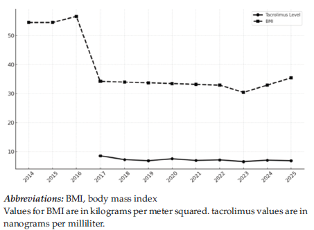 Figure 2. Changes in Tacrolimus Levels and Body Mass Index for the Period 2014-2025