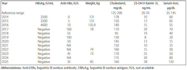 No biliary leakage or stenosis was observed in postoperative cholangiography. The patient was discharged on postoperative day 17. The biliary catheter was removed uneventfully during postope-rative month 6. Vitamin D3, vitamin B12, and iron levels were regularly monitored and supplemented when required. The patient maintained a stable body weight until 2023 (73 kg, BMI 30.4), and at the most recent follow-up in 2025 her body weight was 85 kg (BMI 35.4). During the long-term follow-up period, the patient did not develop diabetes mellitus, hypertension, or dyslipidemia. Seven years after LDLT, the patient remained stable without graft rejection or features of metabolic syndrome (Table 2).