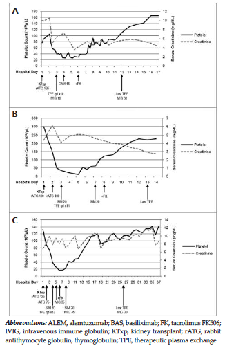 However, we cannot entirely rule out other causes of thrombotic microangiopathy. We did not attempt rechallenge with thymoglobulin. Our patients subsequently received induction therapy that consisted of basiliximab or alemtuzumab followed by maintenance therapy with tacrolimus, prednisone, and myco-phenolate mofetil, and thrombotic microangiopathy did not reoccur. Ceasing thymoglobulin and administering therapeutic plasma exchange therapy, with or without intravenous immunoglobulin, resolved microangiopathic hemolytic anemia and thrombocytopenia. Two of our patients continue to demonstrate stable allograft function; however, one patient developed a nonfunctional primary allograft.