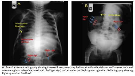 Abdominal radiography showed increased lucency overlying the liver, the Rigler sign, air fluid levels within the bowel loops, and air under the diaphragm (Figure 1A and 1B). She underwent an operation and received broad-spectrum antibiotics. Intraoperative findings revealed multiple small bowel perforations and peritonitis; therefore, a small bowel resection was done. During follow-up, the patient died due to sepsis. It should be noted that written informed consent was taken from her parents before study.