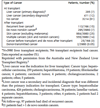 Analyses of de novo cancer in liver transplant recipients have now followed the renal transplant methodologies, and there are publications from the European,12 Australian,13,14 and US registry experiences.9