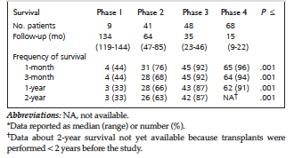 The overall median follow-up for all patients was 26 months (range, 9 to 144 mo). Frequency of 1-month, 3-month, 1-year, and 2-year survival increased from phase 1 to 4 (Table 5). Kaplan-Meier plots showed significant improvement in patient survival from phase 1 to 4 (P ≤ .001) (Figure 1). The most frequent causes of death were sepsis and bleeding (Table 6). In most patients who died, death occurred within 1 month after transplant (Table 6).