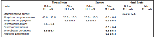 Conclusions: Before transplant, 66.6% of patients showed Streptococcus pneumoniae and Staphylo-coccus aureus in their respiratory tract. After transplant, there were qualitative and quantitative changes in the microbial spectrum of patients. We found that 40.0% of patients had multidrug-resistant gram-negative isolates.