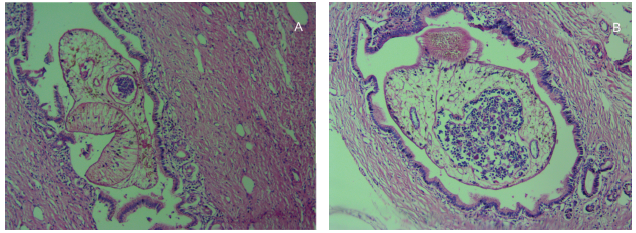 Figure 1. Presence of Adult Dicrocoelium Worm in Bile Duct Showing (A) Head and (B) Body