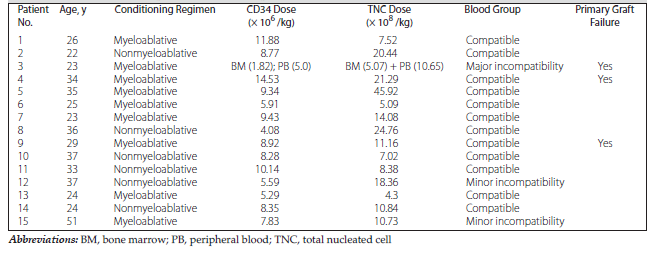 A retrospective study conducted by the Center for International Blood and Marrow Transplant Research found that, in those undergoing bone marrow graft transplant procedures, low cell levels (total nucleated cells ≤ 2.4 × 108/kg) increased the PGF risk by 40%. In addition, in those receiving peripheral blood transplants, a CD34-positive cell dose < 2 × 106/kg had no effect on PGF, and no GF threshold was apparent. It has been suggested that CD34 cell dose is an important predictor of secondary GF.13,14 In our study, the lowest total nucleated cell dose infused was 4.3 × 108/kg, and the lowest CD34 dose was 5.29 × 106/kg, which were apparently adequate. Data for our study patients are shown in Table 2.