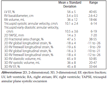 Results: Overall mean systolic pulmonary artery pressure was 26±7 mm Hg (range, 14-44 mmHg). Three-dimensional end-diastolic (r = 0.75; P < .001) and end-systolic volumes (r = 0.55; P = .001)correlated well with systolic pulmonary artery pressure. Right ventricular ejection fraction and right atrium volume also significantly correlated with systolic pulmonary artery pressure (r = 0.49 and P = .01 for both). However, right ventricular 2- and 3-dimensional strain, tricuspid annular plane systolic excursion, and tricuspid annular velocity did not.