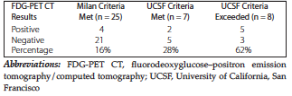 Several investigators have reported controversial conclusions and inadequate sensitivity of PET for detecting various malignancies11-12,14,19-21. In evaluating the role of FDG-PET CT for detecting HCC in pre-LT patients, we found our results to be in agreement with other reports that evaluated the role of PET scans in patients with HCC. We have shown that the FDG-PET CT scan has low use in patients whose HCC meets the Milan criteria and should not be routinely used as part of the pre-LT work-up. However, FDG-PET CT may have a role in detecting tumors in patients whose HCC exceeds the UCSF criteria.