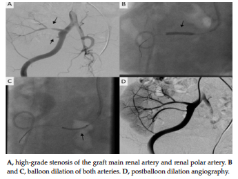The most common vascular complication is RAS, with an estimated incidence of 19% to 23% in all transplant recipients.5,6 In our centers, the rates are 0.5% to 0.75%. The complication frequently presents with worsening or refractory hypertension, with or without graft dysfunction, in the absence of rejection, ureteric obstruction, or infection. Different locations and timing of disease onset may reflect different causes. For example, an anastomotic stenosis is most likely related to trauma to the donor or recipient vessels during retrieval, clamping, or suturing and usually arises early after the transplant. The diagnosis of RAS is made using US, magnetic resonance angiography, and angiography. Our preferred initial option for treatment is the interventional radiologic approach. When this is not successful, we resort to surgical reconstruction.7,8 In our 3 patients with RAS in the first week after RT, we performed urgent surgery. In the 14 patients with late RAS, we used percutaneous interventional techniques (Figure 1). About 50% of RAS is located at the anastomosis, and end-to-end anastomoses have a threefold higher risk than end-to-side anastomoses. Our RAS patients included 10 with end-to-side anastomoses.