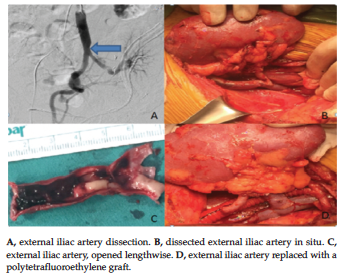 Traumatic EIAD following RT is a rare complication, but it should be managed urgently due to its devastating effect on graft- and lower-limb circulation. EIAD is seen more often in recipients with diabetes mellitus and comorbid diseases. Recipients with EIAD should be treated immediately using either percutaneous angioplasty or surgical reconstruction. The literature describes some patients treated with percutaneous angioplasty and stenting or endarterectomy.12 The other option for treatment is reconstruction with a PTFE graft. In our series, we only noted EIAD in 3 patients. All were traumatic EIAD from vascular clamping, and we treated them with the PTFE graft-reconstruction technique (Figure 2), in which the dissected part of the external iliac artery is resected and replaced with a PTFE graft that is 6 to 8 cm in length and 8 mm in diameter, using 6-0 Prolene. The renal artery is then anastomosed to the PTFE graft with continuous 7-0 Prolene.