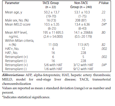 Results: The groups were similar in terms of patient sex, mean age, mean alpha-fetoprotein levels, and Milan criteria. The nontransarterial chemoembolization group had a significantly higher mean Model for End-Stage Liver Disease score. Hepatic artery thrombosis after liver transplantation was diagnosed in 6 of 22 patients (27%) in the transarterial chemoembolization group and in 12 of 240 patients (5%) in the nontransarterial chemoembolization group (P = .002). Retransplant was performed in 5 of the 6 patients with hepatic artery thrombosis in the transarterial chemoembolization group and 3 of the 12 patients in the nontransarterial chemoembolization group (P = .04).