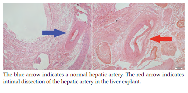 Six of the 22 patients (27%) in the TACE group were diagnosed with HAT after liver transplantation; the diagnosis was made in 12 of the 240 patients (5%) in the group without TACE (P = .002). Retransplantation was performed in 5 of the 6 patients with HAT in the TACE group and 3 of the 12 patients with HAT in the non-TACE group (P = .04) (Table 1). Three of the 5 retransplanted patients in the TACE group were still alive at last follow-up (median follow-up, 380 days). Two of the 3 patients who underwent retransplantation in the non-TACE group died in the early period (< 1 month); the other patient died during long-term follow-up (2 years after retransplantation). Histopathologic examination of the explanted grafts of 3 patients in TACE group revealed intimal dissection in the hepatic artery (Figure 1).