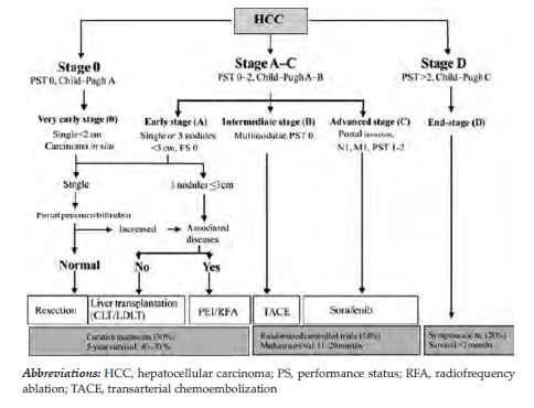 The Barcelona Clinic Liver Cancer (BCLC) classification takes into account cancer characteristics (number and size of nodules, macrovascular invasion, and extrahepatic metastasis), cirrhosis-related variables (liver function and portal hypertension), and general health status of the patients (performance status) (Figure 1). These parameters allow the 5 distinct HCC stages to be associated with different prognosis and specific treatment recommendations to be identified.6 These treatments based on disease stage are listed below.