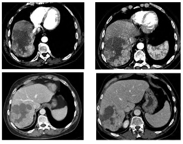 Figure 5. Computed Tomography Showing Hypervascular Irregular and Large Hepatocellular Carcinoma Lesion (top panels) and Stable Lesion for 2 Years After 1 Session of Chemoembolization and Radioembolization (bottom panels)