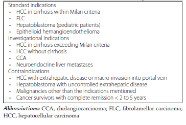 In 1967, Starzl and associates performed the first successful LT for a patient diagnosed with hepatoblastoma.3 Liver transplant is currently incorporated into treatment regimens for specific nonhepatocellular malignancies. Table 1 summarizes indications and contraindications for LT in patients with malignancies.4 In addition to hepatocellular carcinoma (HCC), hepatoblastoma and epithelioid hemangioendothelioma are also standard indications for LT. Investigational indications include cholangiocarcinoma and neuroendocrine liver metastases. However, hepatoblastoma with uncontrolled extrahepatic disease is a contraindication for LT.