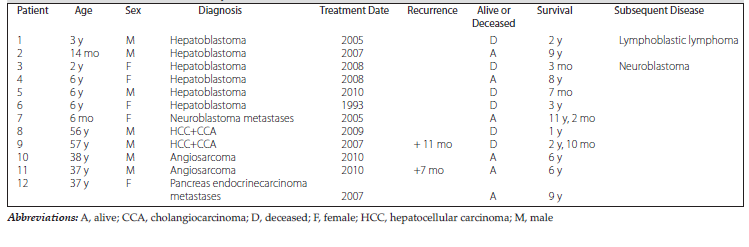 Between December 8, 1988 and October 31, 2016, Baskent University performed 526 LT procedures. Of these, 12 patients hadLT for non-HCCmalignancy. As shown in Table 2, 6 patients had hepatoblastoma, 2 had cholangiocarcinoma, and 2 had angiosarcoma. Half of the patients died, with others to date alive. Survival rates were between 3 months and 3 years.