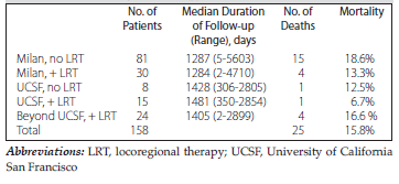 Results: A total of 642 adult liver transplants were performed during the study period (290 living donor and 352 deceased donor), of which 158 (24.6%) were conducted in patients with hepatocellular carcinoma (104 men and 54 women). Hepatocellular carcinoma was associated with hepatitis C in 80 patients (51%), hepatitis B in 44 (28%), and was cryptogenic in 13 (8%). Patients were grouped based on their radiologic staging (within Milan, within and beyond University of California, San Francisco), and subsequently described by whether they received locoregional therapy. Median survival and mortality were noted. Kaplan-Meier survival curves showed no statistically significant difference for patients within the Milan criteria, with or without locoregional therapy (P = .5). When patients within the Milan criteria were combined with patients within the University of California, San Francisco criteria, those who were downstaged from outside the latter criteria had similar survival.
