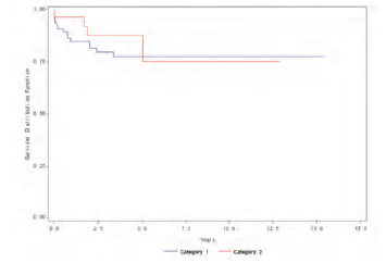 Figure 2. Comparison of Survival in Patients Within the Milan Criteria, With (Category 2) and Without (Category 1) Locoregional Therapy (P = .5)