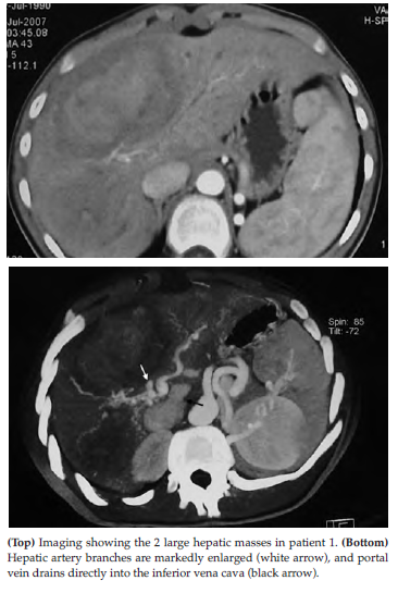 Computed tomography and magnetic resonance imaging (MRI) of the abdomen showed 2 large tumors (4 and 8 cm) in the liver; the intrahepatic branches of the portal vein could not be identified (Figure 1, top). The portal vein drained directly to the vena cava just below the level of the right inferior hepatic vein; the hepatic arteries were markedly enlarged (Figure 1, bottom). T1-weighted MRI of the brain revealed hyperintense signals in the globus pallidus, a finding that is considered compatible with hepatic encephalopathy. The Stanford-Binet intelligence scale showed moderate mental retardation (IQ 39). Biopsy of the larger mass revealed severe fibrosis and regenerative hyperplasia; however, malignancy could not be definitely excluded for the whole lesion. Although the IQ could be considered as a contraindication, the fact that he could take care of himself during intervals between encephalopathy episodes and the possibility that the shunt could be a culprit in his cognitive defect led to a decision to proceed with liver transplant.