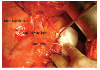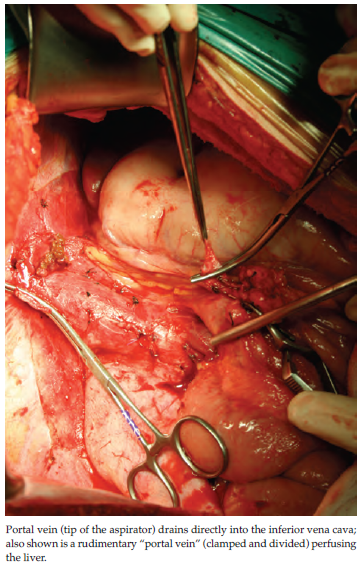 The right hepatic lobe without the middle hepatic vein was procured in the usual manner from his 31-year-old brother. The recipient had a shortportal vein that drained directly into the vena cava (Figure 2). The congenital portacaval shunt was disconnected, and the recipient’s portal vein was used to provide inflow to the graft.