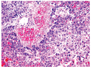 Figure 5. Hepatocellular Carcinoma Showing Sites of Extensive Hemorrhage and Foci of Tumor Necrosis (hematoxylin and eosin staining; ×200)