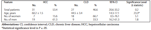 We conducted a cross-sectional analysis of a prospective study that included patients with HCC and chronic liver disease who had been treated in the Department of Hepatopancreatic Surgery from 2015 to 2017. Of 58 patients treated, 31 had HCC (53.4%) and 27 had other chronic liver diseases (46.6%). Our total patient group included 30 women (51.7%) and 28 men (48.3%) with an average age of 55.6 ± 1.7 years. The 31 patients with HCC ranged in age from 34 to 70 years (60.2 ± 1.5; 61.3% men and 38.7% women) (Table 1).