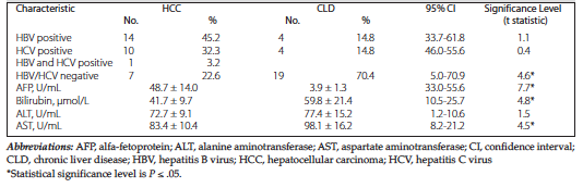 Materials and Methods: We performed a cross-sectional analysis of a prospective study performed at the JSC National Scientific Center of Surgery (named after A. Syzganov). The study included 58 patients: 31 with hepatocellular carcinoma (53.4%) and 27 with chronic liver disease (46.6%). The average age of patients was 55.6 ± 1.7 years.