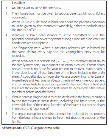 The frequency of talking frankly about the patient’s condition and providing information is important. The donation rate was low when families were surprised to be asked about donation; having frequent interviews that are started before the donation request are associated with favorable outcomes.6 In the standardized interview that we conducted, the frequency and duration of the interviews done with the families were recorded as they are extremely important; interviews should be done frequently and thoroughly to explain the condition of their relative, and unlimited visits with their relative should be allowed if the intensive care unit conditions are appropriate. We recommend that a first interview should be done when the Glasgow coma scale is < 5. Interactions with families of potential donors should be done properly, not only to ask for consent but also to allow families to accept the imminent loss of their loved ones.