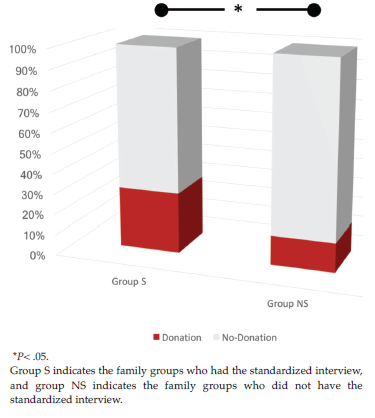 Results: Of 17 families who participated in standardized interviews, 5 families (29.4%) agreed to donate organs of their brain-dead relatives. In the other group of families, intensivists governed informing the families of donation without standardized interviews. In this group of 35 families, 5 families (14.3%) approved organ donation. The decision regarding whether to agree to organ donation was statistically different between the 2 family groups (P < .05).