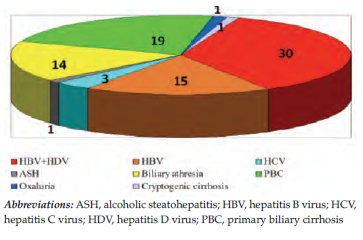 Figure 1 shows the causes of liver diseases. Causes included progression of liver cirrhosis and hepatocellular cancer, with 30% having HBV and hepatitis D virus (HDV). The second most frequent pathology was primary biliary cholangitis (primary biliary cirrhosis; 19% of patients), and the third most frequent was chronic HBV (monoinfection).