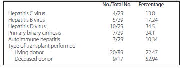 Materials and Methods: Liver transplant recipients undergoing liver biopsy between 2012 and 2017 were analyzed. Our study included 40 liver biopsies in 29 patients after orthotopic liver transplant who fulfilled the inclusion criteria.