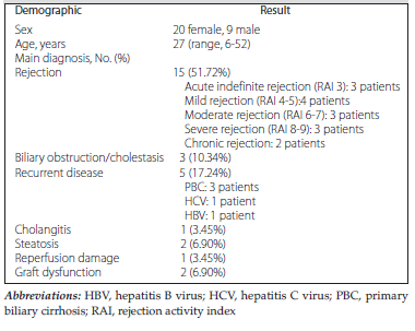 There were a total of 40 liver biopsies in 29 patients after OLT who fulfilled the inclusion criteria. The biopsies were classified according to the main histologic diagnosis. All biopsies were clinically indicated. Of the 29 patients, 20 were female patients and 9 were male patients, including one 6-year-old child (girl). The causes of terminal liver disease in these patients was HDV in 34.5%, primary biliary cirrhosis in 24.1%, HBV in 17.24%, HCV in 13.8%, and autoimmune hepatitis in 10.34%. Table 1 presents the patient demographic characteristics and transplant data, including indications for OLT in the study cohort.